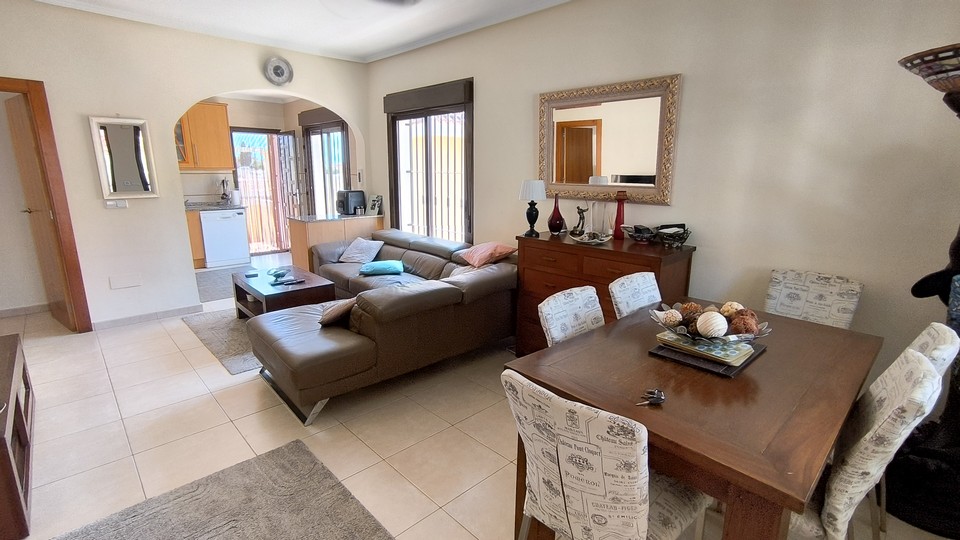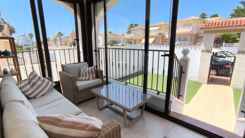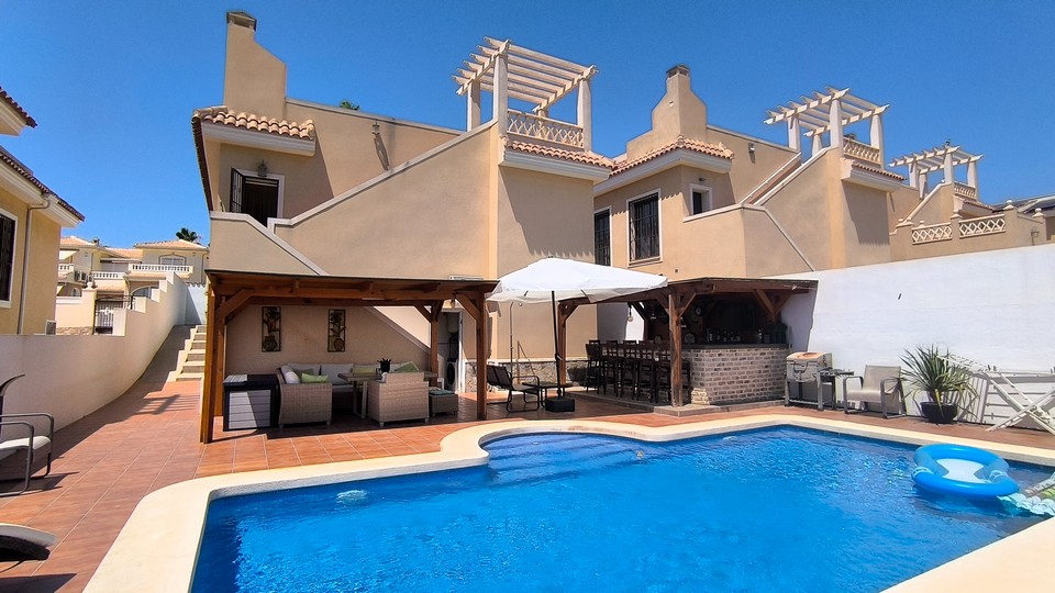 Located in the tranquil La Fiesta area of Ciudad Quesada, this impressive detached villa offers space, style and flexibility. The main floor features three double bedrooms and two bathrooms, along with a bright and spacious open-plan lounge, kitchen and dining area. At the front of the villa, a glazed terrace provides a warm and comfortable winter room.