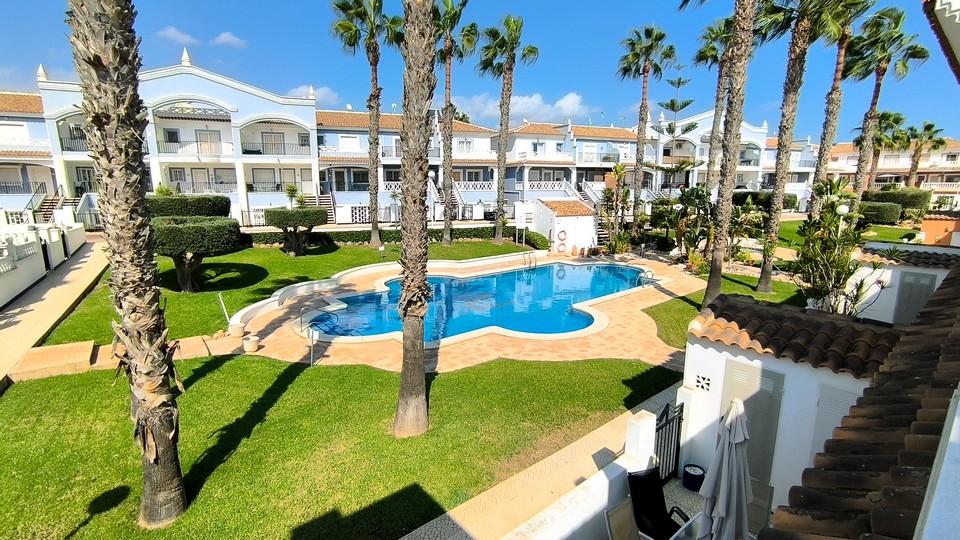 Inside, the ground floor offers a bright lounge and dining area, ideal for entertaining family and friends. There is also a double bedroom and a convenient shower room on this level. The separate kitchen is in excellent condition and large enough for family food preparation. The rear garden has been tiled and has a large utility room for your storage needs. From the garden, owners enjoy direct access to the stunning communal gardens and pool. The pool features a large swimming area and a separate children’s pool.