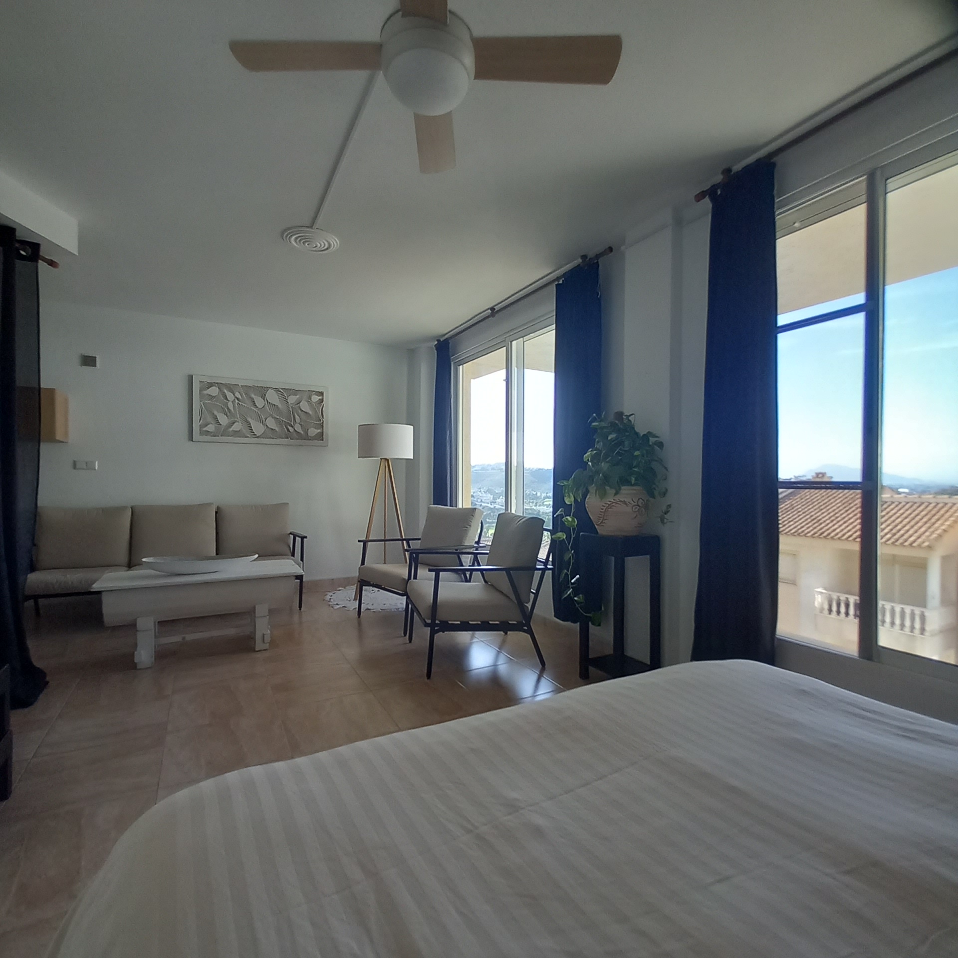 Downstairs you have a very spacious bedroom area which could be further separated if desired, another bedroom which is used as a music studio and a family bathroom. There is also a utility room. This area also has amazing views from the large windows (electric shutters), and has access to its own terrace area, perfect for seating and BBQs. The property comes with air conditioning throughout for cooling and heating, and is sold partially furnished subject to offer.